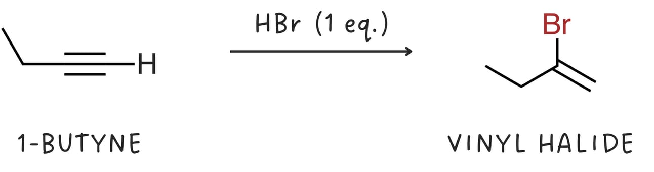 Alkynes react with one equivalent of hydrogen halide (HX, where X is a halogen like Cl or Br) to form vinyl halides.