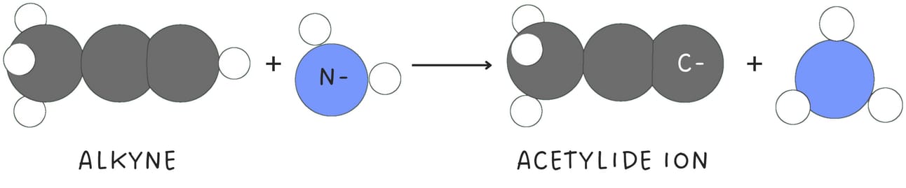 When terminal alkynes are treated with a strong base such as NaNH2, the terminal hydrogen is removed, forming an acetylide ion.
