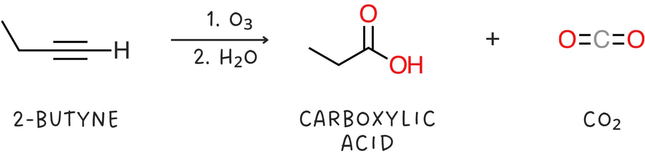 Alkynes can be cleaved when treated with oxidizing agents such as ozone or KMnO4 followed by H2O.