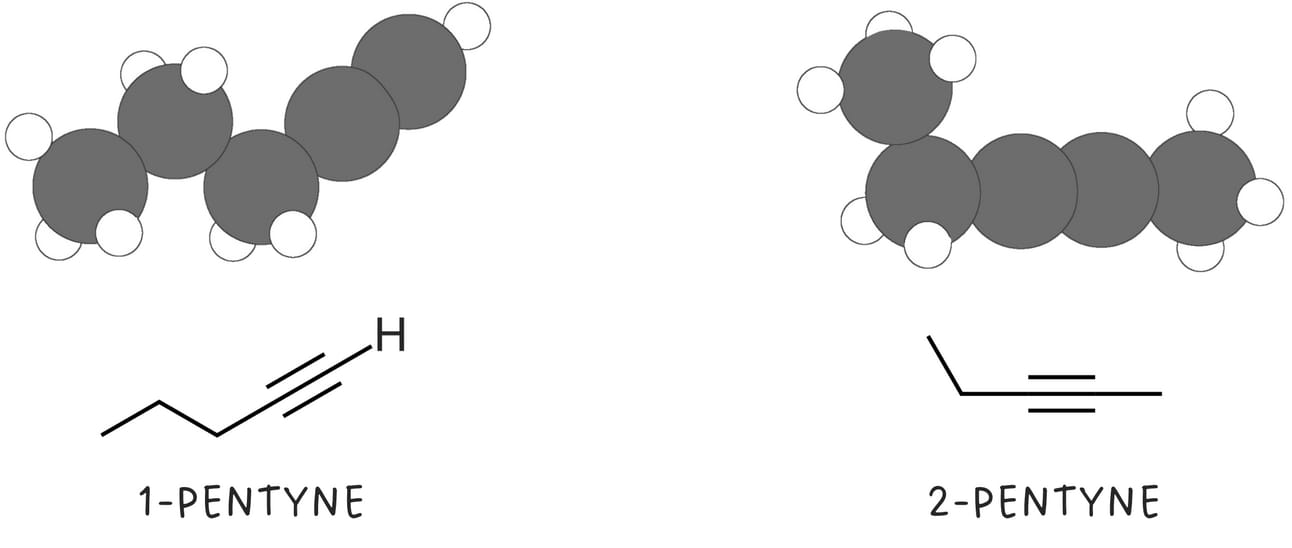 Terminal alkynes contain a triple bond at the end of the carbon chain. Typically, one hydrogen is bonded to one of the carbons of the triple bond.