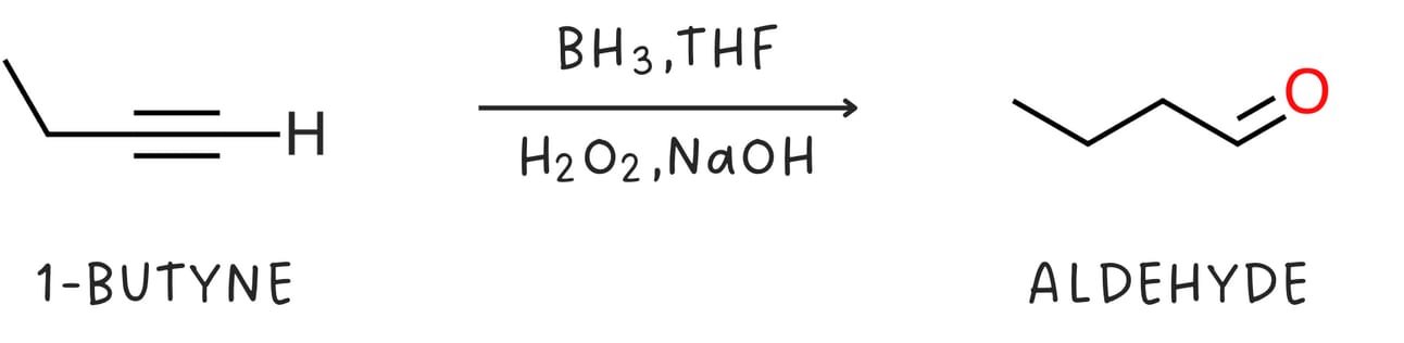 Like alkenes, alkynes undergo hydroboration-oxidation, which occurs with anti-Markovnikov regiochemistry as the -OH adds to the less substituted carbon. The initial enol product is unstable and quickly rearranges to form a more stable aldehyde (for terminal alkynes) or ketone (for internal alkynes)