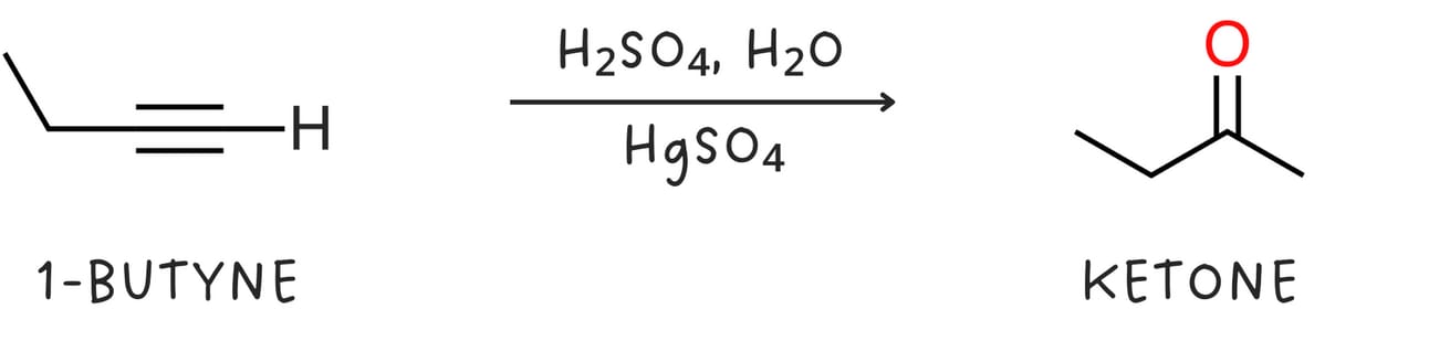 Unlike alkenes, alkynes react slowly with aqueous acid alone. Mercury(II) sulfate (HgSO4) is used as a catalyst to speed up the reaction. This reaction occurs with Markovnikov regiochemistry as the -OH group adds to the more substituted carbon. The initial enol product is unstable and quickly rearranges to form a more stable ketone.
