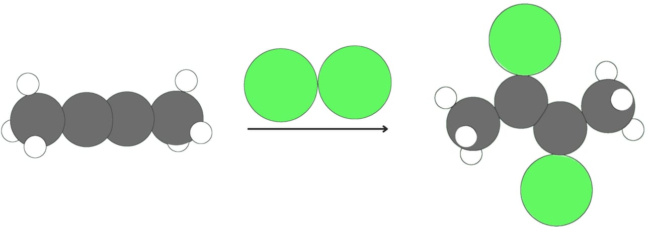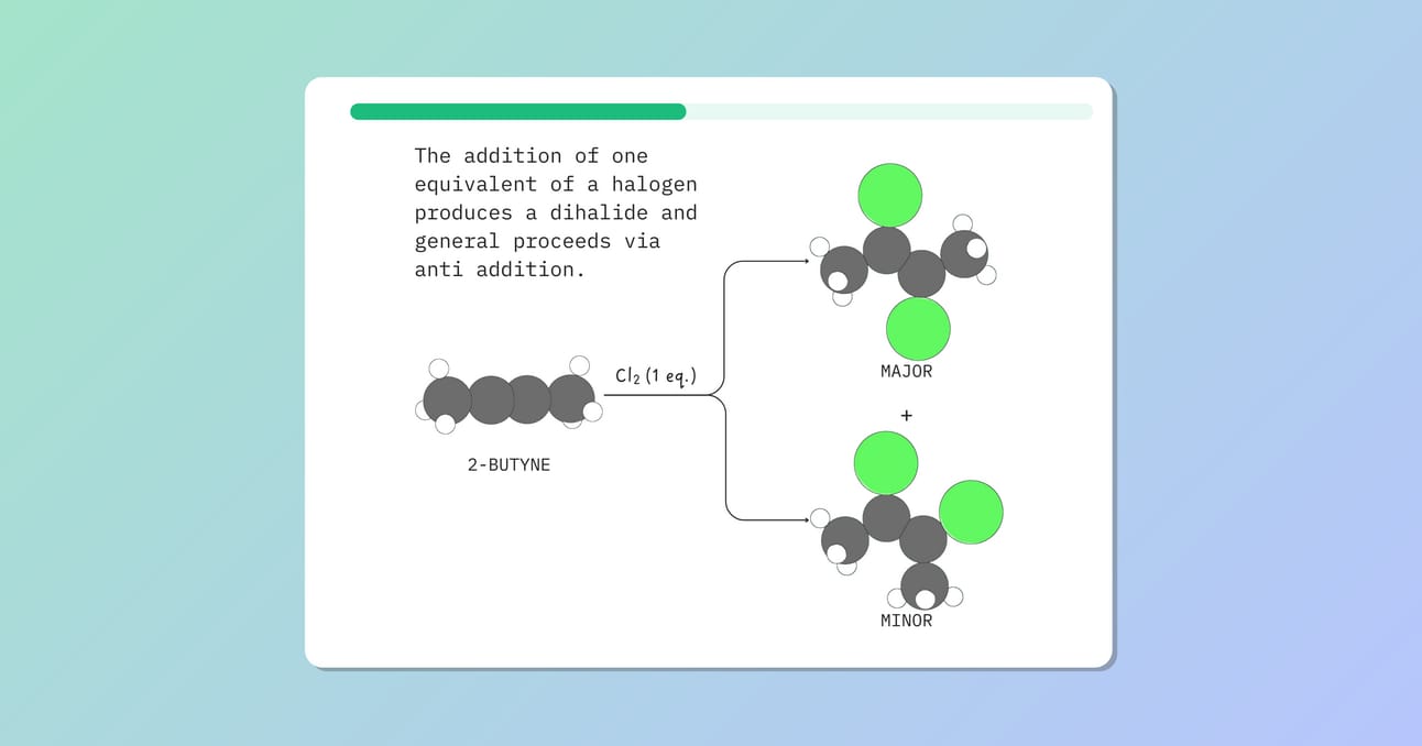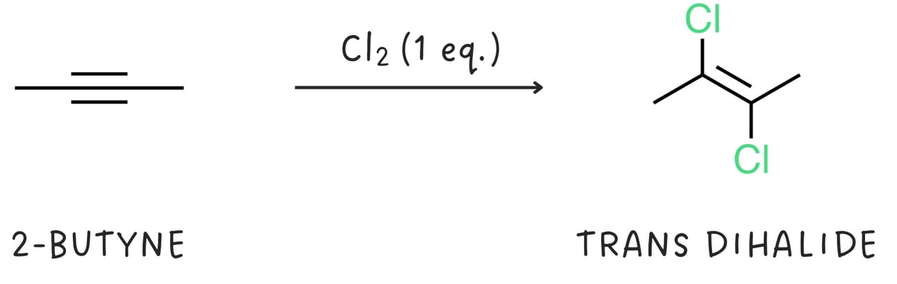 Alkynes react with halogens like Cl2 or Br2. The addition of one equivalent of a halogen produces a dihalide and generally proceeds via anti addition.