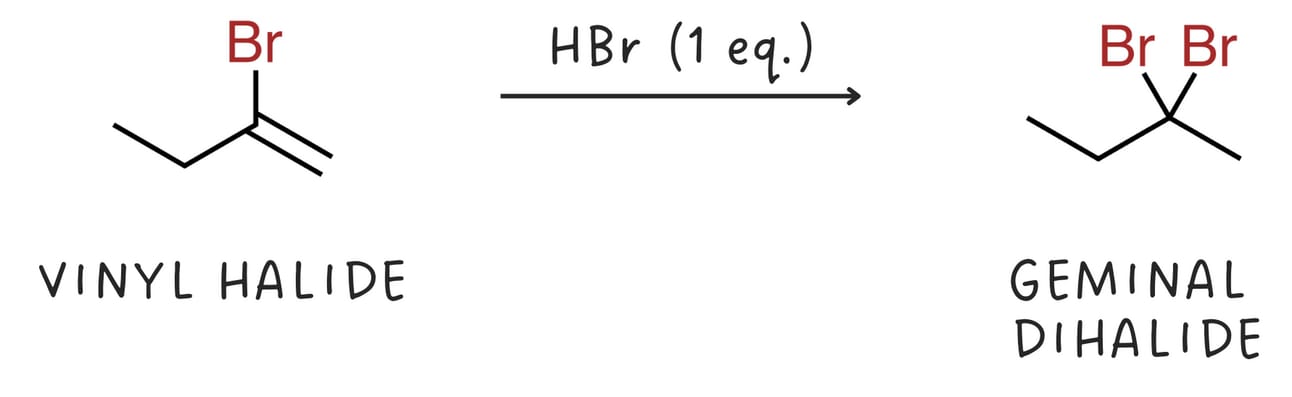 Vinyl halides can further react with HX to form geminal dihalides.